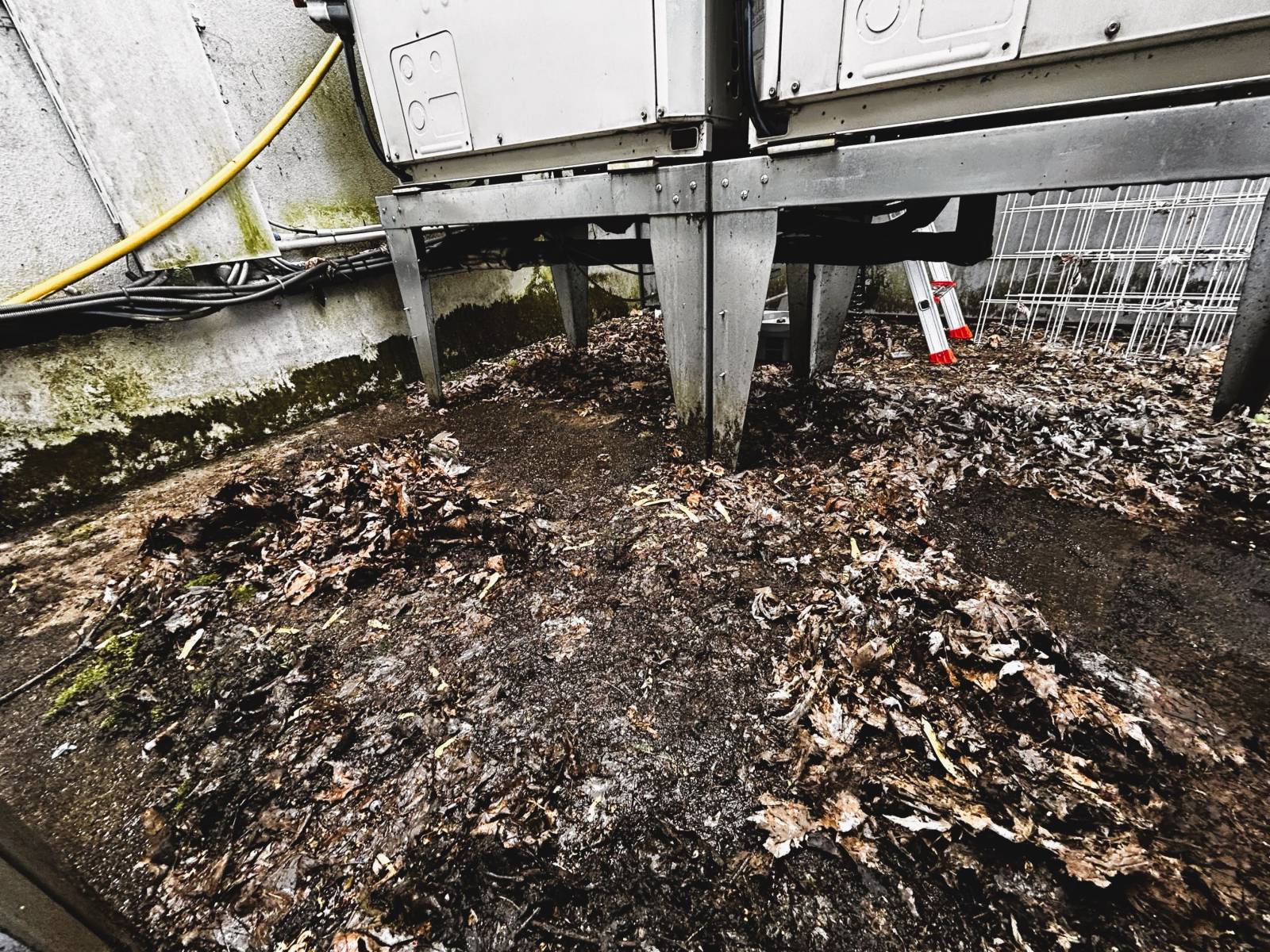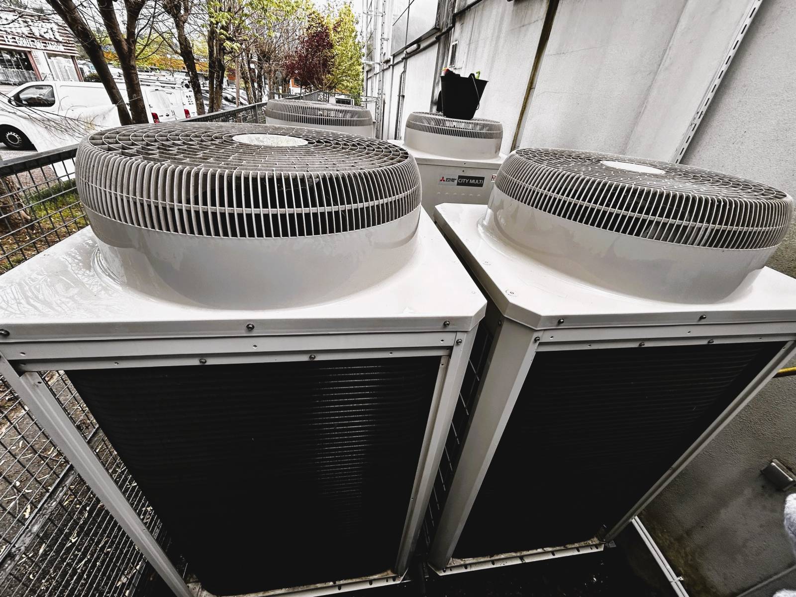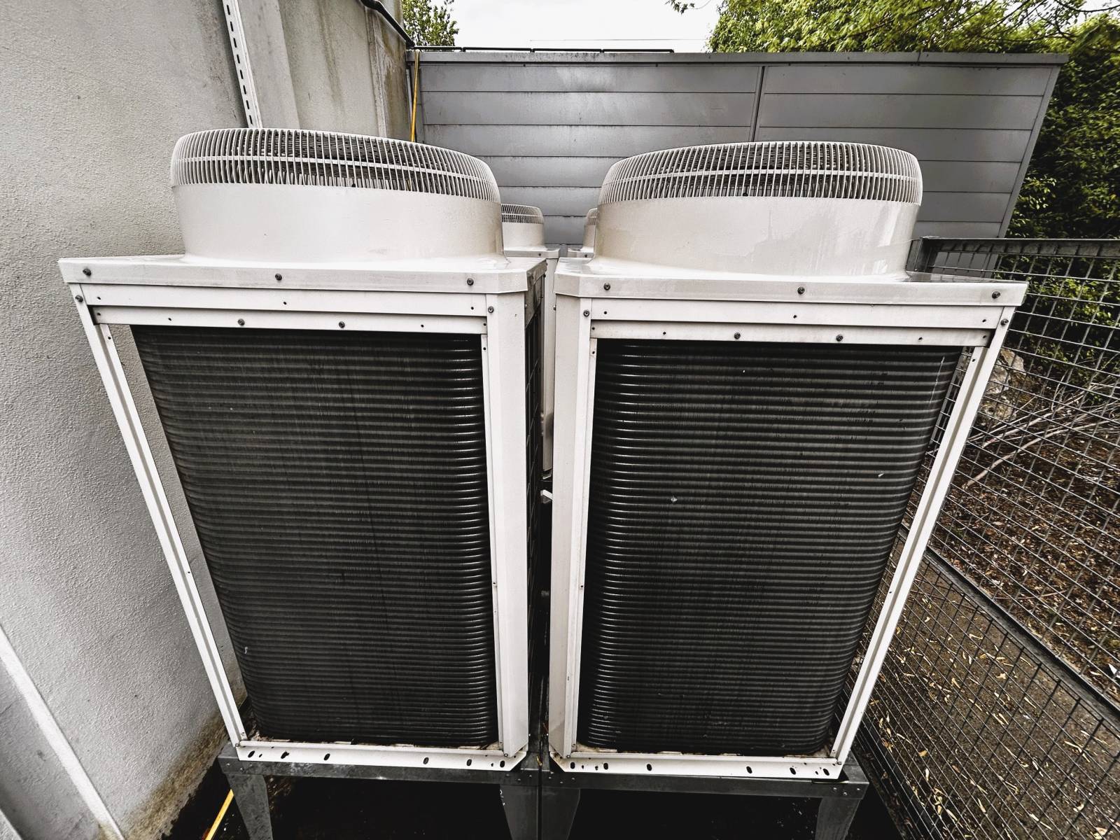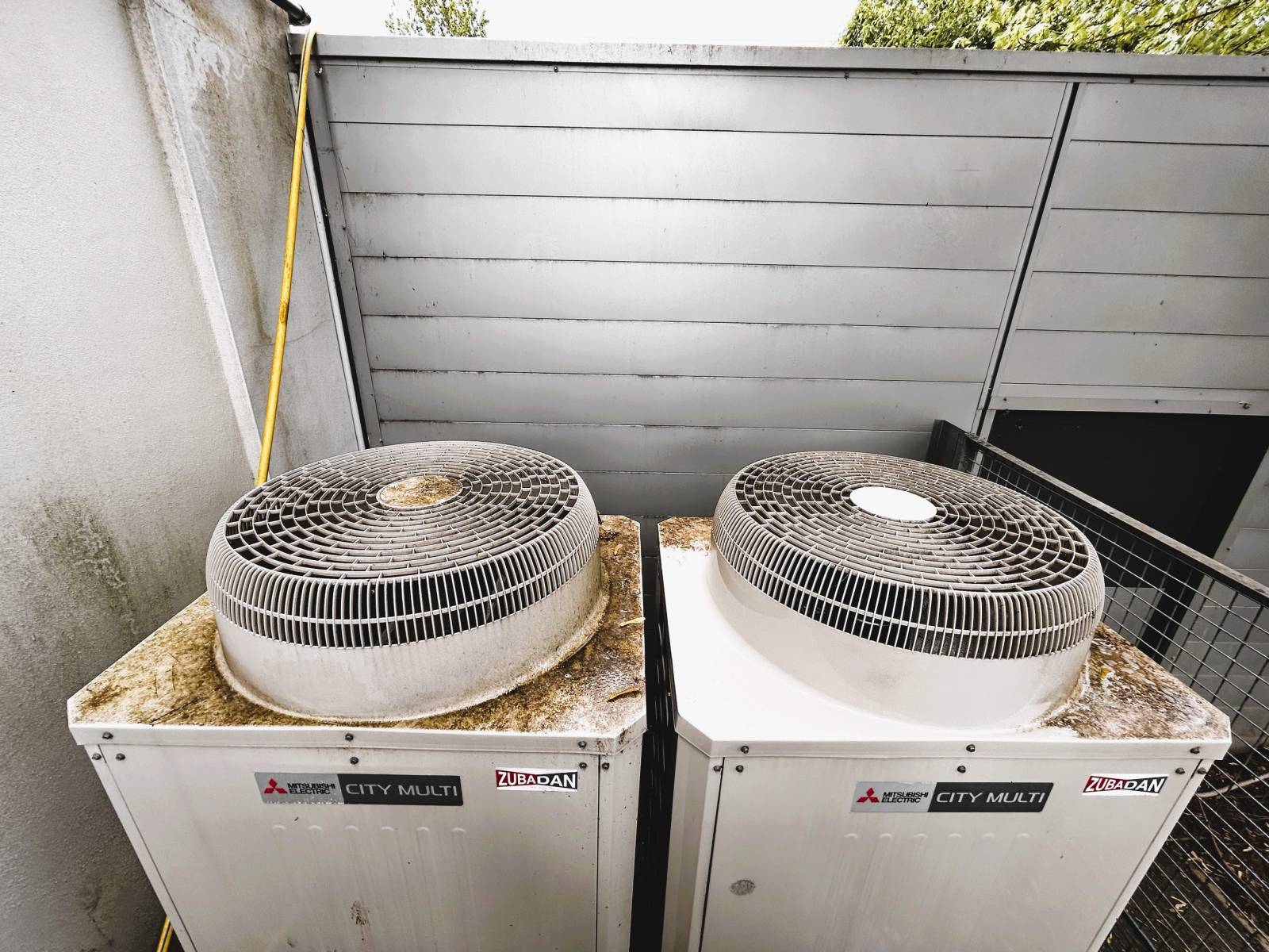 Entretien haute pression des groupes extérieurs de climatisation à La Motte-Servolex, en Savoie, lors de la grande visite d'entretien avant l'été, dans des établissements professionnels.