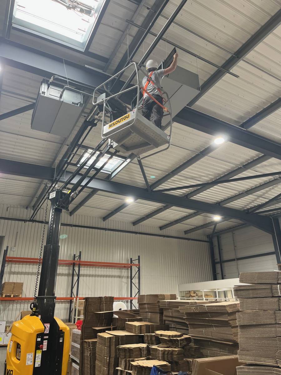 La nacelle offre un accès sécurisé aux zones en hauteur lors des opérations de remplacement de filtres ou de nettoyage de façade effectuées lors de nos visites de maintenance. Elle réduit significativement les risques associés à l’utilisation d’échelles, souvent moins stables et plus exposées aux chutes.