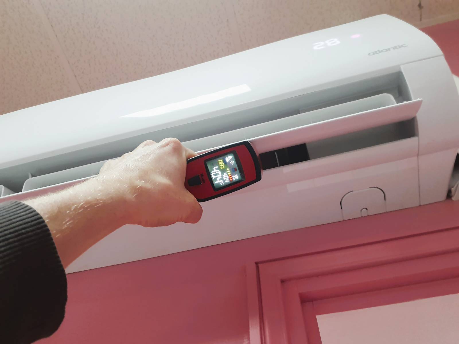 Un exemple de test de fonctionnement effectué lors de la mise en route est la prise de température de soufflage/reprise. En mode chauffage, la température de soufflage de l’unité intérieure murale Atlantic est de 45°C pour une reprise à 22°C, tandis qu’en mode refroidissement, la température de soufflage est de 8°C pour une reprise à 21°C. Ce test est réalisé à l’aide d’un thermomètre électronique infrarouge professionnel.