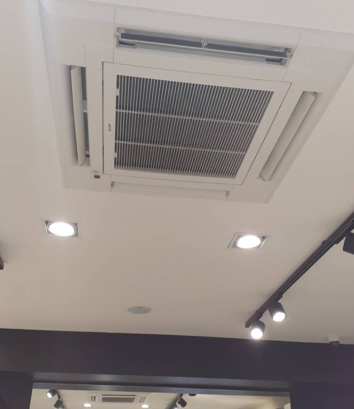 Une unité cassette est un type d’unité intérieure de climatisation conçue pour être encastrée dans un faux plafond, généralement au centre d’une pièce. Seule la grille décorative (souvent blanche et discrète) reste visible, tandis que le corps de l’appareil est dissimulé. Comme toute unité intérieure, la cassette est reliée à un groupe extérieur via un circuit frigorifique.