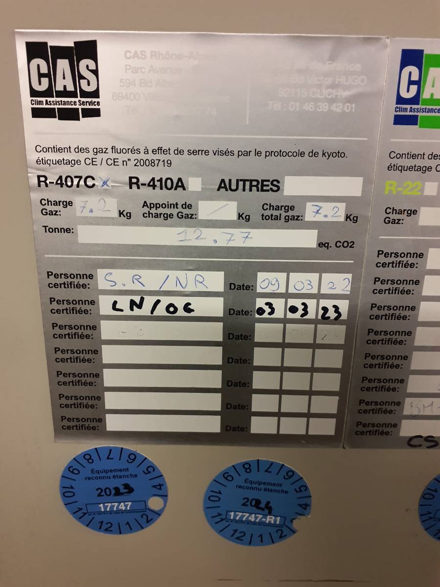 Accompagnée de cette certification, nos techniciens apposent également une étiquette en aluminium, permettant un suivi visuel des visites d'entretien (Date de passage, personne, charge gaz de l'installation, etc) , tant pour le client que pour nos techniciens. (Bien que ces informations soient également enregistrées dans la base de données client).